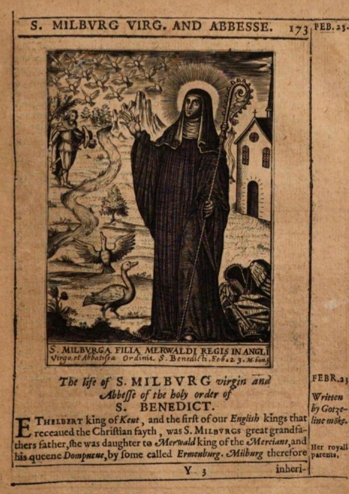 Illustration, St. Milburga, engraving by Martin Baes, 1632, p. 173 from The lives of the Most Renowned Saincts of the three kingdoms England Scotland, and Ireland... Doway, 1632. This image comes from a scan of the book in the Bavarian State Library. https://www.google.com/books/edition/The_Flowers_of_the_Lives_of_the_Most_Ren/H15lAAAAcAAJ?hl=en&gbpv=0